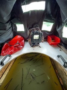 We hadden 7 vijvers ter beschikking , afhankelijk van de grote van de vijver lagen er 1 of 2 drijfhutten klaar . We gingen elke ochtend en avond erin en deden we een sessie van minstens 4u . Overdag was er tijd om uit te rusten en te eten.